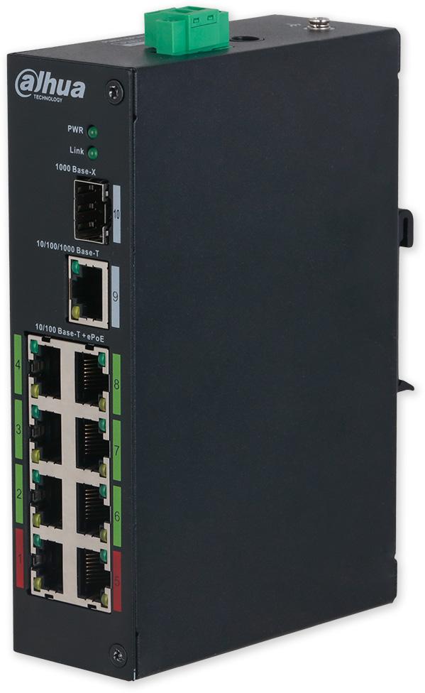 Comutator ePoE într-un design industrial cu un interval de temperatură crescut. Alimentare camera Dahua ePoE până la 800 m prin UTP sau 1000 m prin cablu coaxial, 2 x Hi-PoE 10/100 Mbps până la 90 W, 6 x PoE+ 10/100 Mbps până la 30 W, 1 x...